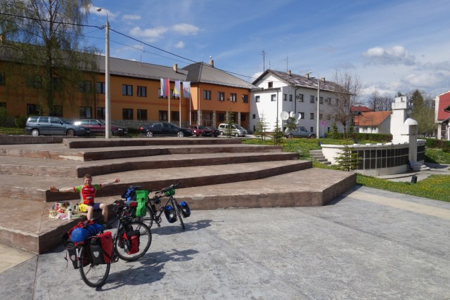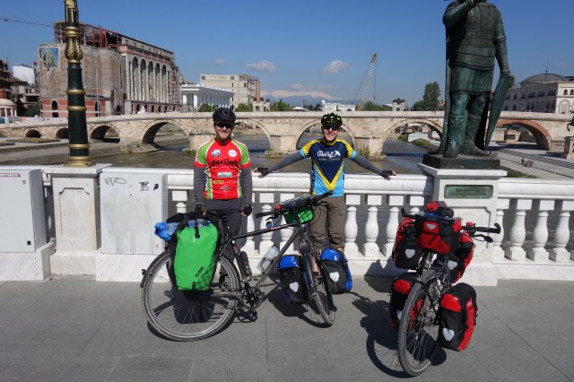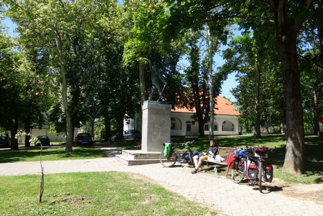 Nachdem wir glückliche Besitzer mehrerer griechischer Flaggen sind, lässt sich Arpad es nicht nehmen uns noch die typisch ungarische Süßigkeit in einem kleinen Kiosk zu kaufen, eine Art Milchschnitte mit Schokoladenmantel. Zu guter Letzt fahren wir noch zum bekannten Heldenplatz, wo er seine Weltumrundung gestartet und beendet hat. Er würde uns gerne noch eine ganze Stadtführung geben und auf ein Bier einladen, doch leider müssen wir weiter, denn unser warmshowers Gestgeber Viktor wartet schon auf uns.