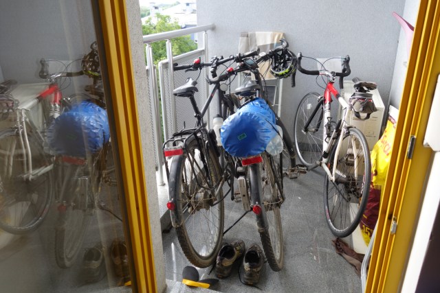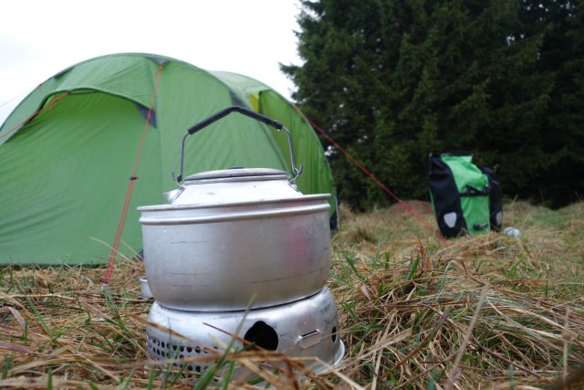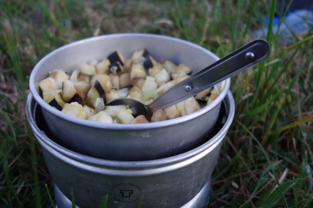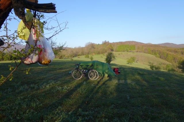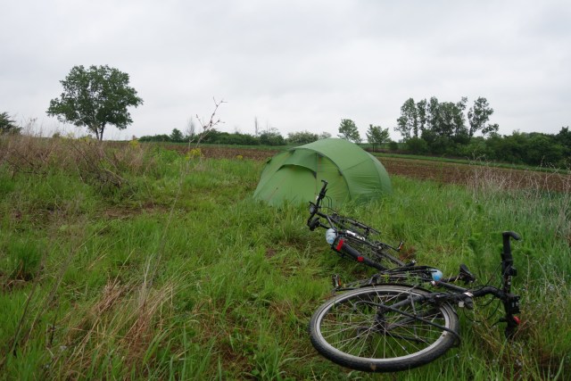 So fragen wir schließlich in einem Ort die Nachbarn einer unbebauten Wiese, ob wir dort zelten könnten. Unsere bewährte Notfallmethode. Die Frau gibt uns zu verstehen, dass dies absolut kein Problem sei. So schieben wir unsere Räder auf die etwas hügelige Wiese und während Vincent das Zelt aufschlägt fängt Leon an zu kochen. Heute gibt es Süßkartoffeln mit Auberginen-Paprika-Tomaten Pfanne. Sehr lecker!