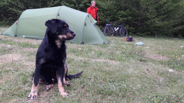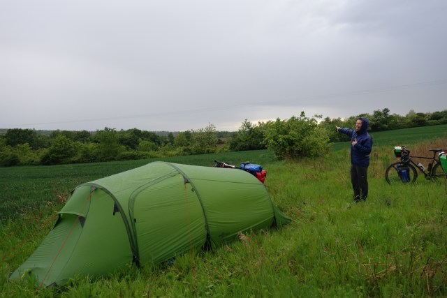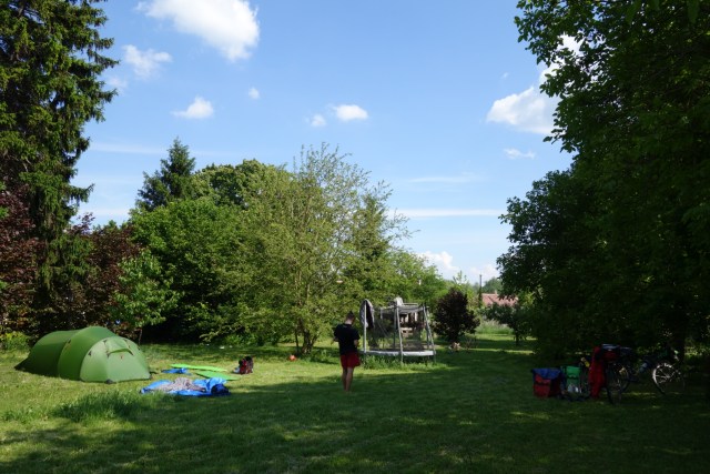 Kurze Zeit nachdem wir das Zelt aufgeschlagen haben, kommt nochmal unsere heutige Nachbarin an den Zaun und gibt Leon Bescheid, dass diese Wiese bis September frei sei. So lange haben wir dann doch nicht vor zu bleiben, doch Leon dankt trotzdem lächelnd für diese außerordentlich hilfreiche Information.