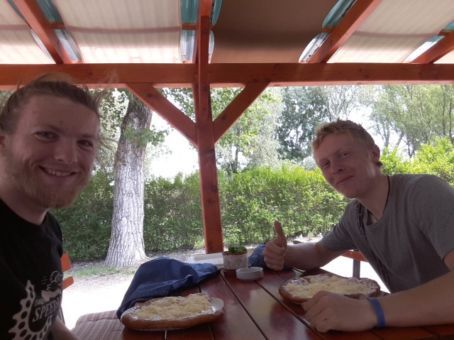 In Gyenesdiás finden wir schließlich das richtige Haus. Nur wenige hundert Meter vom See entfernt ist das Grundstück deutlich größer, als wir erwartet haben. Miklos und seine Familie wohnen hier und wir entschließen uns dazu, unser Zelt in dem wirklich großen und gut gepflegten Garten aufzuschlagen. Dann hält uns aber fürs erste nichts mehr und wir suchen hungrig etwas zu Essen. Uns wurde ein Imbiss empfohlen, der Langos verkauft, eine ungarische Spezialität. Also bestellen wir uns jeder eine der von Fett triefenden Köstlichkeiten, die aus fritiertem Teig bestehend, belegt mit Rahm und viel Käse wirklich super für eine Fahrradtour sind.