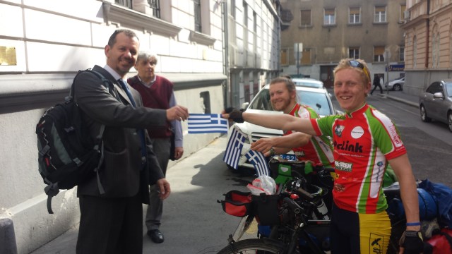 Plötzlich kommt ein anderer Fahrradfahrer von hinten herangefahren und begrüßt uns freundlich, er stellt sich uns als Arpad vor. Wir kommen mit ihm ins Gespräch und es stellt sich heraus, dass er selbst vor einigen Jahren mit seiner Frau eine vierjährige Weltumrundung mit dem Fahrrad gemacht hat. Deswegen scheint er in Ungarn sogar eine kleine Berühmtheit unter Radlern zu sein, da es hier deutlich weniger Menschen gibt, die so eine lange Reise unternehmen. Er begleitet uns auf seinem Nachhause-Weg zur griechischen Botschaft, die zufälligerweiße auf dem Weg liegt.