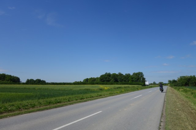 Mit vollem Magen radelt es sich deutlich besser! Das gute Wetter hält an, sodass wir bis zum Mittag gut durchradeln. Die Landschaft besteht weiterhin größtenteils aus Feldern abgewechselt von kleinen Waldstücken. „Das könnte wirklich bei uns zu Hause um die Ecke sein!“, meint Leon.