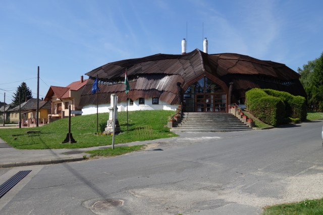 Zum Glück haben wir in unserer Notreserve diverse Energieriegel dabei, von denen wir uns jeder einen genehmigen. Fast 30 Kilometer und einige kleine Orte später kommen wir in Bak an, in dem es endlich einen ABC-Supermarkt gibt. Auf einer Bank vor einer interessant konstruierten Stadthalle lassen wir uns ein großes Radlermüsli schmecken. Das wurde auch höchste Zeit!