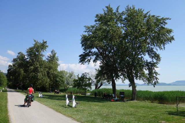 Da wir gestern eine entspannte Etappe von knapp 70 km hatten, müssen wir heute etwas mehr auf die Tube drücken. Unser Tagesziel ist, soviel wie möglich aber auf jeden Fall über 100 km. Zum Glück ist die heutige Strecke ziemlich flach und wir fahren die meiste Zeit am idyllisch gelegenen Plattensee entlang. Zu unserer Freude gibt es um den gesamten Plattensee eine ausgeschilderte Radstrecke, die zu großen Teilen auch einen eigenen, gut ausgebauten Radweg besitzt.