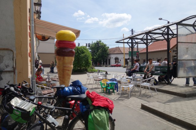 Wie frisch geduscht fahren wir noch eine gute Stunde weiter, bis wir entkräftet in einem kleineren Ort nicht unweit von unserem Tagesziel Budapest in einem Eiscafé Rast einlegen und uns von Hamburger über Kuchen bis hin zu Eis üppig beglücken. Danach heißt es aber endgültig die letzten 30 km bis nach Budapest in Angriff zu nehmen.