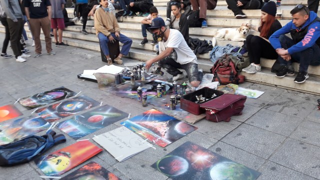 Am Nachmittag treffen wir uns noch mit Madlin. Sie kommt aus Deutschland, studiert in Athen und arbeitet dort nebenbei bei einer deutschen Zeitung, für die wir ein Interview geben. Obendrein bekommen wir ein Paar Insidertipps für Orte in der Stadt, die wir besuchen sollen. Leider reicht die Zeit nicht mehr für alles aus, aber wir spazieren durch das Viertel nahe unserem Hotel (Psyri), das wir bisher nicht näher in Augenschein genommen haben. Sehr viele Graffitis, noch mehr Bars, Cafés und Restaurants und unglaublich viele Menschen gibt es hier.