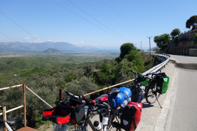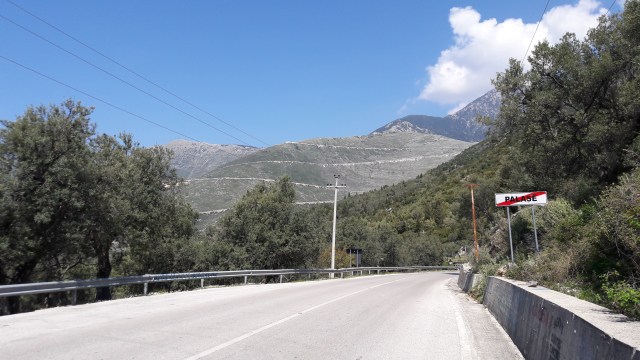 Wir haben uns da ungewollt ziemlich viel vorgenommen für den heutigen Tag. Deshalb hauen wir beim Frühstück, das im Preis inbegriffen ist, ordentlich rein. Mit netten Worten zum Abschied von den anderen Hostelgästen, starten wir die erste große Bergetappe unserer Tour. 230 Kilometer sind es noch mindestens bis Tirana, sodass wir uns wenig Hoffnung machen, wie geplant am Ostersonntag dort anzukommen. Mit einer Mischung aus Euphorie und Ernüchterung zugleich radelt es sich die ersten Kilometer mehr oder weniger beschwingt dahin. Als wir dann tatsächlich vor dem Llogara-Berg stehen, sehen wir, dass die Straßenführung, wie sie auf einer Karte zu sehen ist, fast eins zu eins auch mit der frontalen Sicht auf den Berg übereinstimmt.