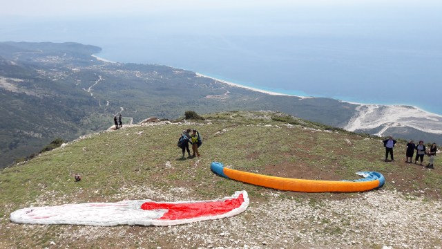 Die Aussicht von fast ganz oben, zwei Paraglyder machen sich bereit zum Abflug.