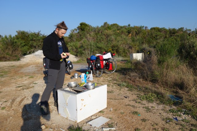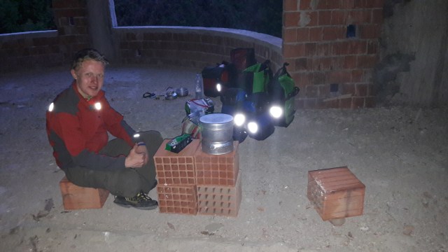 Zwischen Bauschutt, Brombeerranken und herumliegenden Ziegelsteinen schlagen wir unser Lager auf – dank einem Dach über dem Kopf brauchen wir die zweite Nacht in Folge nichtmal ins Zelt zu steigen. Aus den Ziegelsteinen bauen wir uns einen kleinen Tisch und kochen Nudeln mit Pesto, ein schnelles, bewährtes Essen, denn zu mehr sind wir nicht mehr fähig. Auf die Partybeleuchtung aus unseren Little-Sun-Solarplatten verzichten wir dann doch, da in Sichtweite noch andere Häuser stehen.