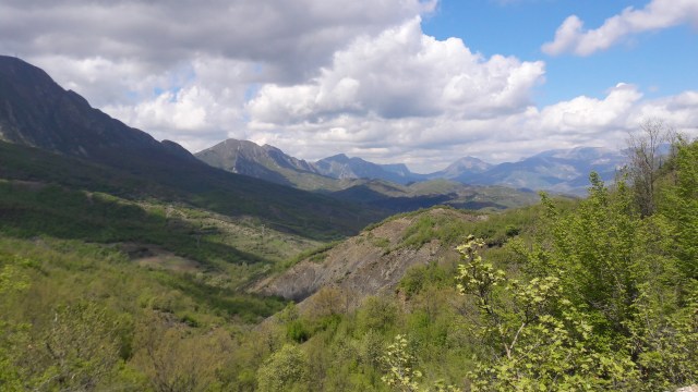 Wenige Minuten später kommen wir im ersten Tal an, wo sich ein reißender Strom entwickelt hat, wo eigentlich mal unser Weg war. Glücklicherweise finden wir ein wenig abseits eine Fußgängerbrücke, welche uns ans andere Ufer bringt. Dort treffen wir auf einen alten Mann, der uns mit viel Zeichensprache und dem albanischen Wort "Kafe" zu einem Kaffee in einer winzigen Bar einlädt. Gestärkt mit diesem kalten sehr süßem Getränk, was dem gewohnten Kaffee in der Farbe ähnelt machen wir uns weiter zum Frühstücksort Klos.