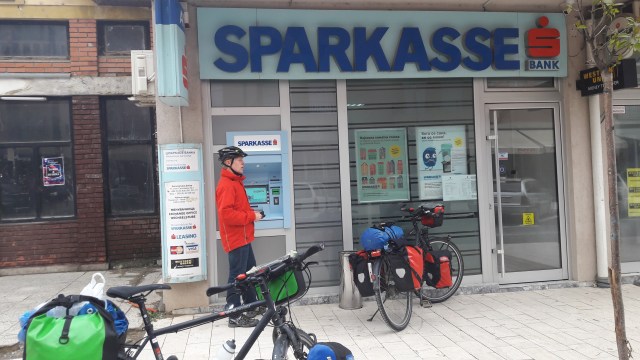 Gegen 10 Uhr überwinden wir uns dann endlich, auf die Räder zu steigen und nachdem wir einen Abstecher bei einer mazedonischen Sparkasse gemacht haben, wo wir uns mit Denar (en?) eindecken, führt uns unsere Route in Richtung Norden.