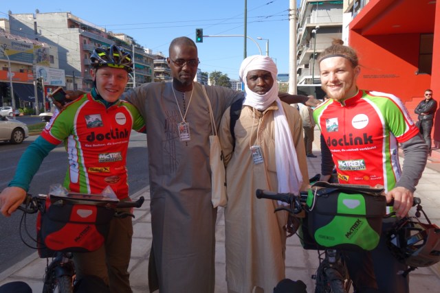 Der heutige Tag soll der erste Tag auf dem Sattel werden und wir können es kaum erwarten endlich unterwegs zu sein. Doch vorher steht noch ein Fototermin mit dem Oberbürgermeister von Kassel (Bertram Hilgen) und dem Bürgermeister Athens (Giorgos Kaminis) an, zu dem wir dank der verwirrenden Adresse beinahe zu spät kommen. Diesen Termin haben wir allein dem Zufall zu verdanken, dass Bertram Hilgen auf dem Hinflug im gleichen Flieger saß wie wir. Wirklich erstaunlich was sich manchmal aus ungeplanten Zusammentreffen alles ergeben kann! Die gemeinsamen Fotos mit der Prominenz erregen auch Aufmerksamkeit bei anderen umherstehenden Leuten, die es sich nicht nehmen lassen können ebenfalls ein paar Fotos mit uns zu schießen 🙂