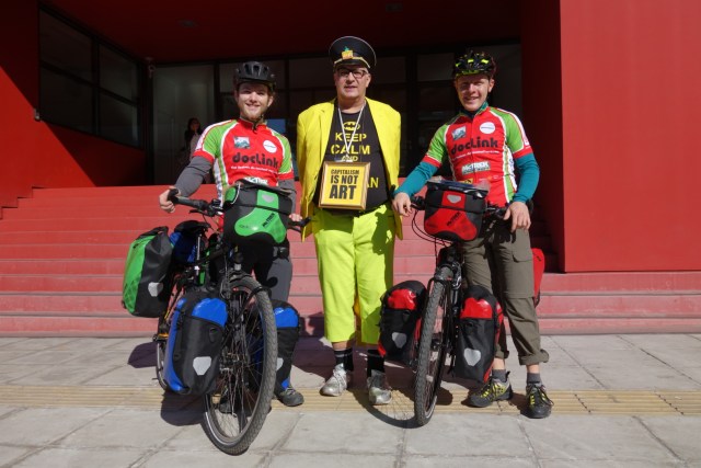 Nach einer kurzen Mittagspause machen wir uns daran, die Räder auszupacken und wieder Reisetauglich zu machen.. das ist weniger aufwändig als zunächst angenommen. 😀 Also auf zu einem Internetcafé ein paar Straßen weiter. Leons kurz vor knapp errungenes Navi muss noch mit dem Kartenmaterial, was wir vor der Abreise über Komoot erstellt haben, bestückt werden. Zum Glück klappt alles reibungslos, sodass wir das Touriprogramm entspannt fortsetzen können. Zum Parlament, in einen sehr schönen Sonnenuntergang hinein. Vor dem Parlament haben sich ein paar Straßenkünstler aufgebaut und machen Musik, sprayen Bilder und verbreiten eine gute Stimmung.