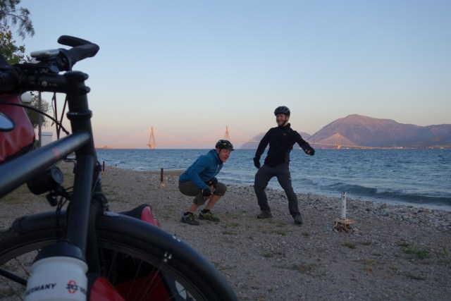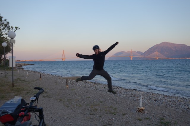 Mit noch leerem Magen aber einem guten Gefühl, so früh schon unterwegs zu sein, nehmen wir die berühmt berüchtigte Rio-Andirrio Brücke in Angriff. Sie verbindet die Peloponnes mit dem Festland und ist über 2 km lang.