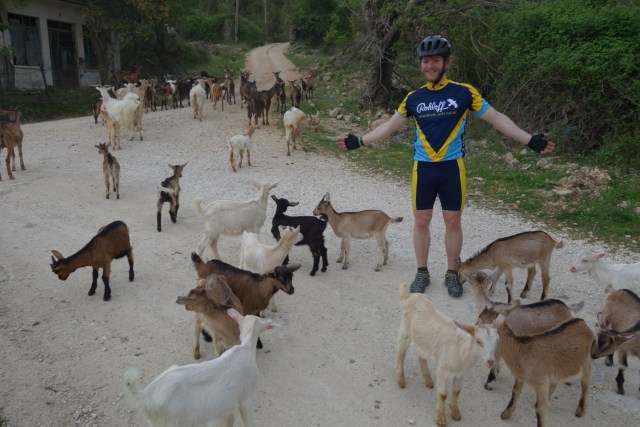 Langsam aber sicher steigt das Gelände an, sobald wir vom Meer wegfahren. Am Ende des Tales fahren wir knapp 200 Höhenmeter auf 10 Kilometer rauf, nur um von einer Herde Ziegen überrannt zu werden, die uns in einem verlassenen Dorf voller Häuserruinen überrascht. Nach dem ersten Schrecken ist es aber ein tolles Erlebnis, eine Runde Streichelzoo zu spielen.