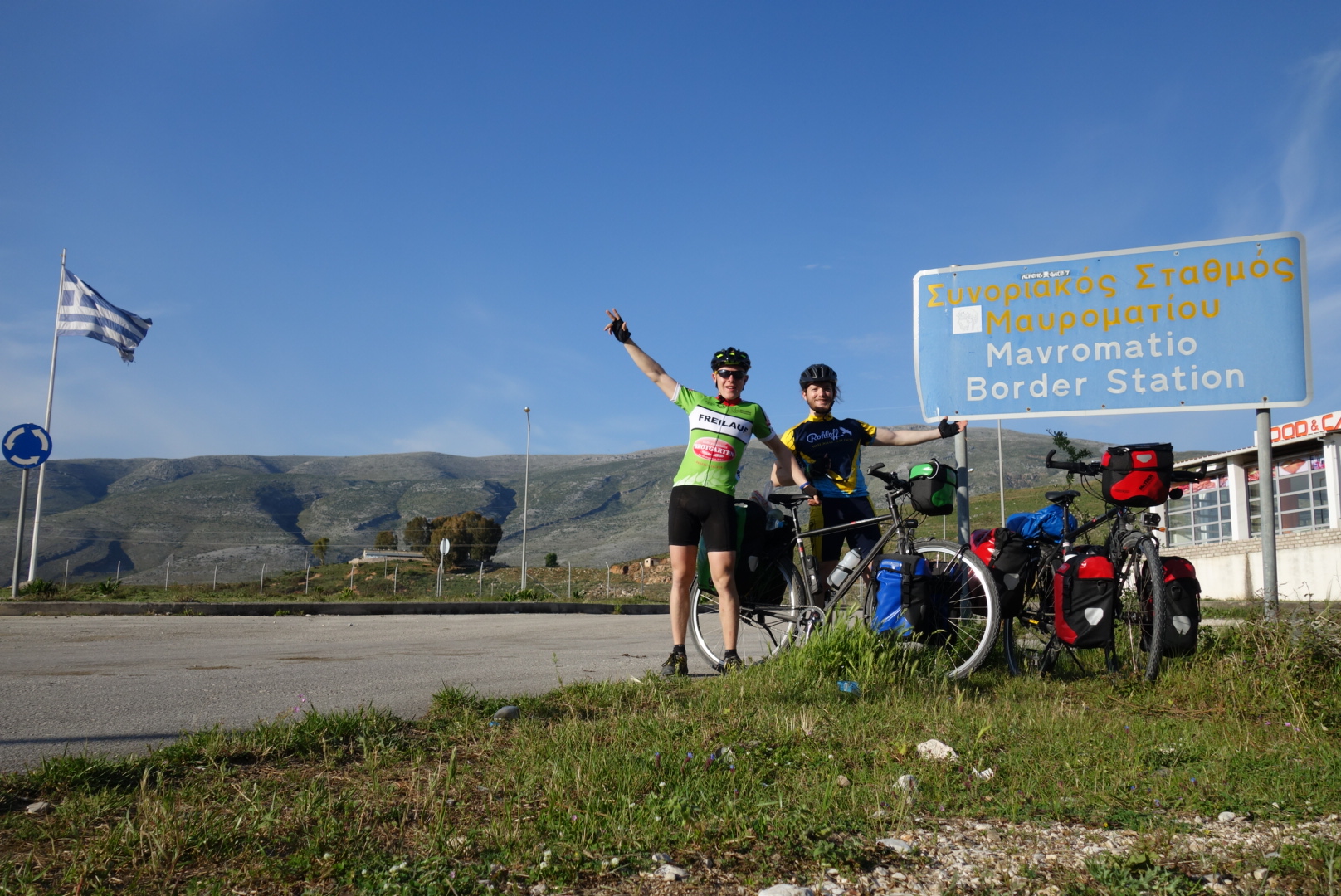 Es ist es soweit! Am späten Nachmittag, die Landschaft ist in ein warmes Licht der tief stehenden Sonne getaucht, überqueren wir zunächst die griechische Grenze und ein paar hundert Meter weiter reisen wir in Albanien ein. Mit unseren gültigen Reisepässen geht es alles schneller als gedacht und an der albanischen Grenze werden wir sogar an der kleinen Autoschlange vorbei gewunken.