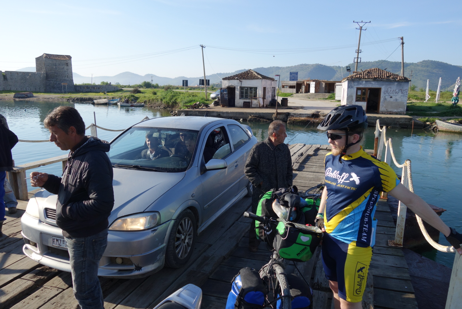 Voller Elan überqueren wir im magischen Morgenlicht die Meeresenge und werden von starken Seitenwind auf der Brücke überrascht. So verschieben wir unser geplantes Frühstück auf hinter die Brücke, wo wir von netten Bauerbeitern auch Wasser bekommen.
