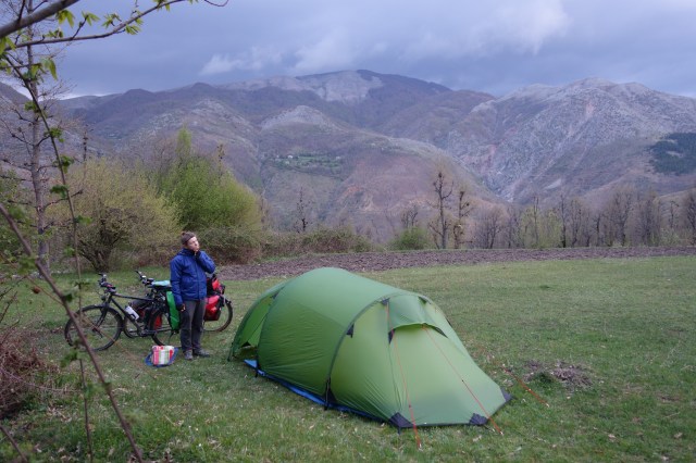 Gegen fünf Uhr entschließen wir uns, den Abstieg für heute zu beenden und schlagen nicht weit eines kleinen Dorfes unser Nachtlager auf. Hin und wieder laufen Leute an uns vorbei ins Tal hinunter, doch niemanden stört es, dass wir hier wildcampen. Ohne einen größeren Ort mit Supermarkt oder Bäcker seit dem nahen Umland von Tirana, sind wir etwas aufgeschmissen, was unser Abendessen angeht. Das Müsli, was wir normalerweise morgens essen, wird jetzt zusammen mit einer Tasse Tee verspeist.