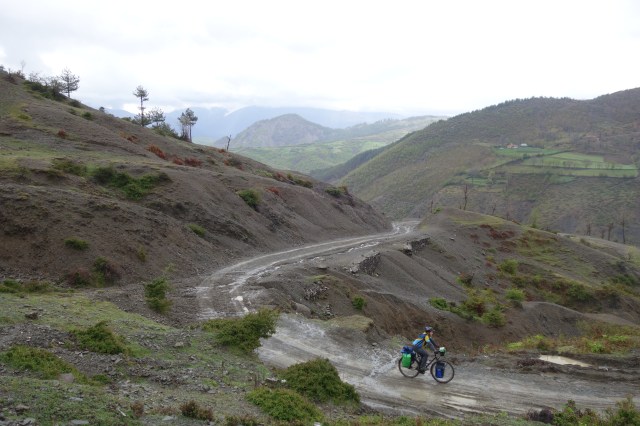 Eine unglaublich schöne Landschaft entschädigt unsere Mühen den Berg hinauf. Dennoch sind wir uns ein wenig am sputen, denn für den Abend sind wieder Regen, Blitz und Donner angekündigt. Als wir den höchsten Punkt des Tages erreicht haben, erwartet uns eine unangenehme Abfahrt. Grobe Steine, kleine Wasserrinnsale und schlammiger Sand bilden die Wege. Dazu oft Gefälle von 10% und deutlich mehr. Das haben wir uns definitiv anders vorgestellt. Wir sind froh, am heutigen Tag überhaupt 50 Kilometer geschafft zu haben. Im Gegenzug sind wir 1900 Höhenmeter gefahren, was wir im nachhinein immernoch ziemlich verrückt finden.