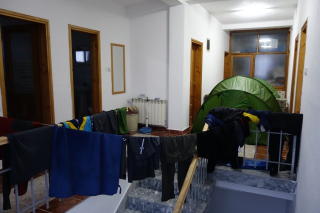 Dienstag: Wahnsinn, wie sich alle Sachen schon wieder verteilt haben! Da wir einen Schlafraum mit sechs Betten für uns allein hatten, haben wir uns natürlich ordentlich ausgebreitet! Um heute noch den bisher größten Berg zu schaffen (leider werden die in den nächsten Wochen noch weiter wachsen), versuchen wir früh wegzukommen. Mit Sack und Pack fahren wir noch durch die Stadt, kaufen ein leckeres Frühstück und machen einen Abstecher in eine Buchhandlung, um einen kurzen Satz in das Anne-Frank-Tagebuch zu bekommen – auf albanisch, versteht sich.